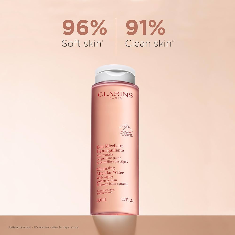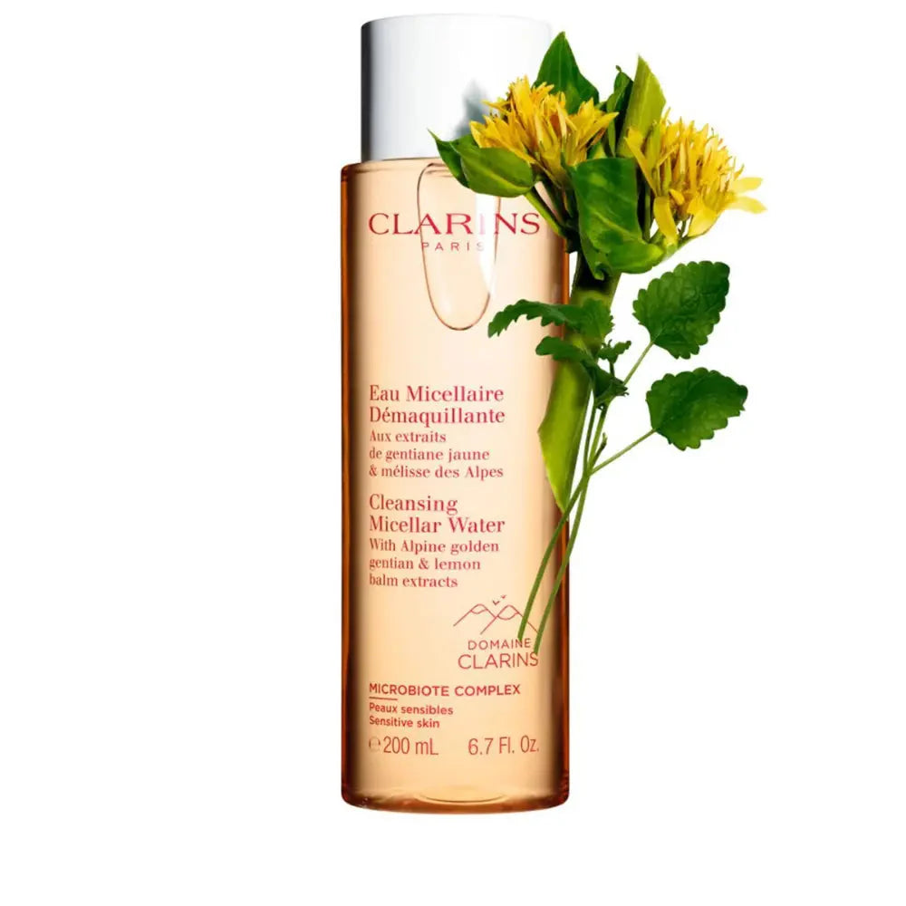 Clarins Cleansing Micellar Water is a refreshing micellar formula that lifts makeup, SPF, and impurities in a single swipe while respecting the skin’s natural balance.